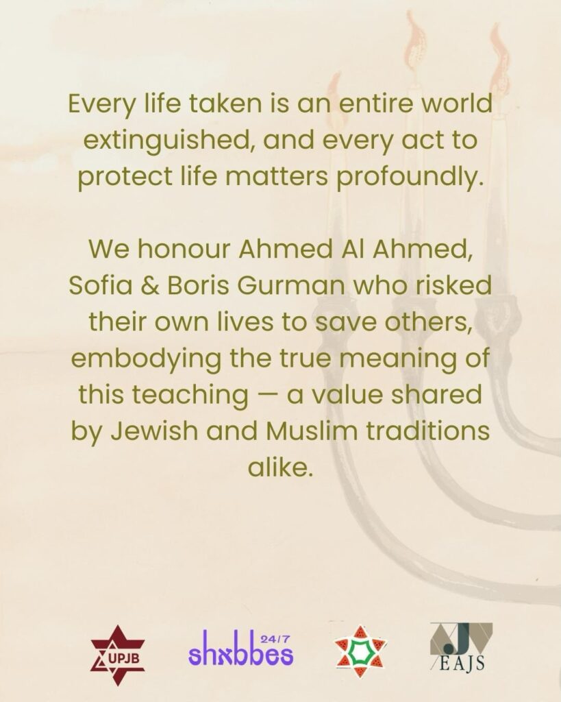 We grieve the lives lost in Boondi and mourn all those harmed by this horrific violence. Jewish tradition teaches us: “For anybody who destroys a single life it is counted as if he destroyed an entire world, and for anybody who preserves a single life it is counted as if he preserved an entire world.” Every life taken is an entire world extinguished, and every act to protect life matters profoundly. We honour Ahmed Al Ahmed, Sofia & Boris Gurman, who risked their own lives to save others, embodying the true meaning of this teaching — a value shared by Jewish and Muslim traditions alike.